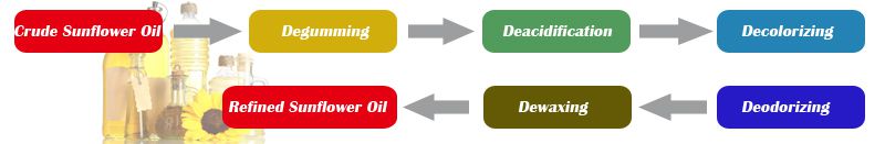 Sunflower seed oil has a light color. The degumming, deacidification, decolorization and deodorization process of sunflower oil processing are basically similar to soybean oil refinery plant. But sunflower oil usually generally needs dewaxing process to reach the national standards for edible cooking oil.